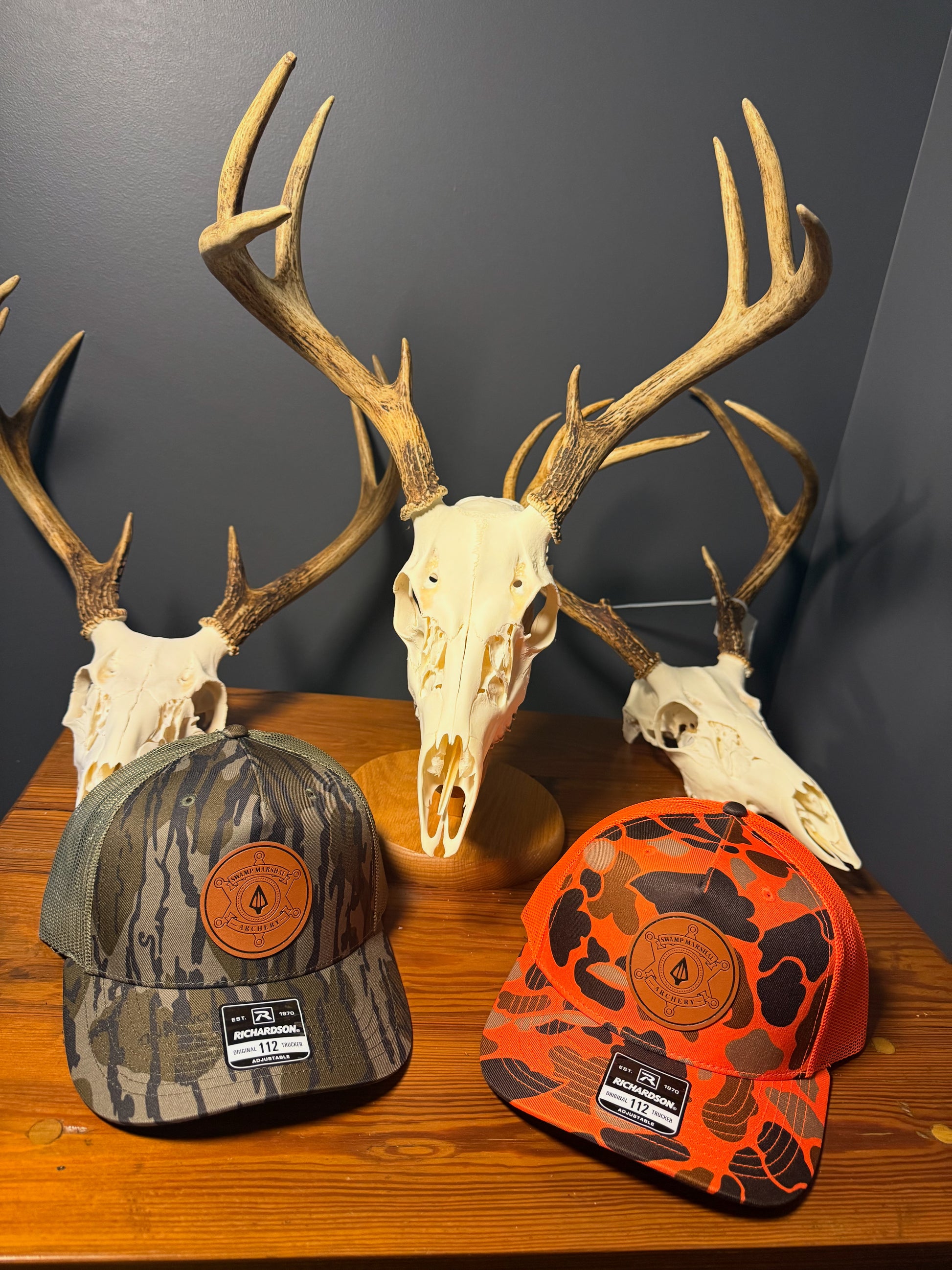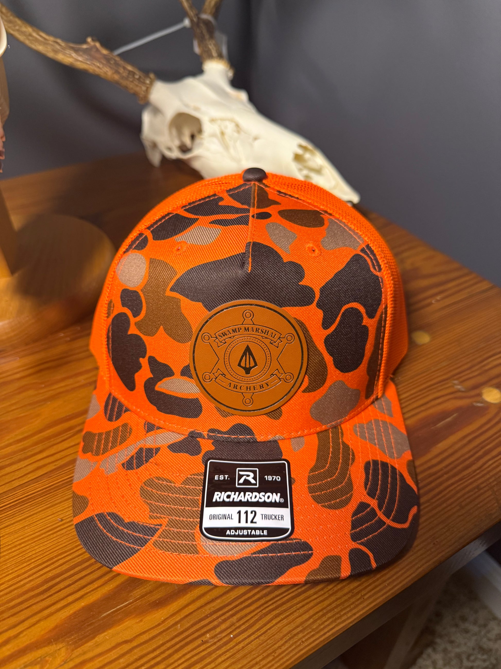 SMA leather badge hats are here! Mossy Oak Bottomland or blaze orange Duck Camo! Richardson 112 hats.